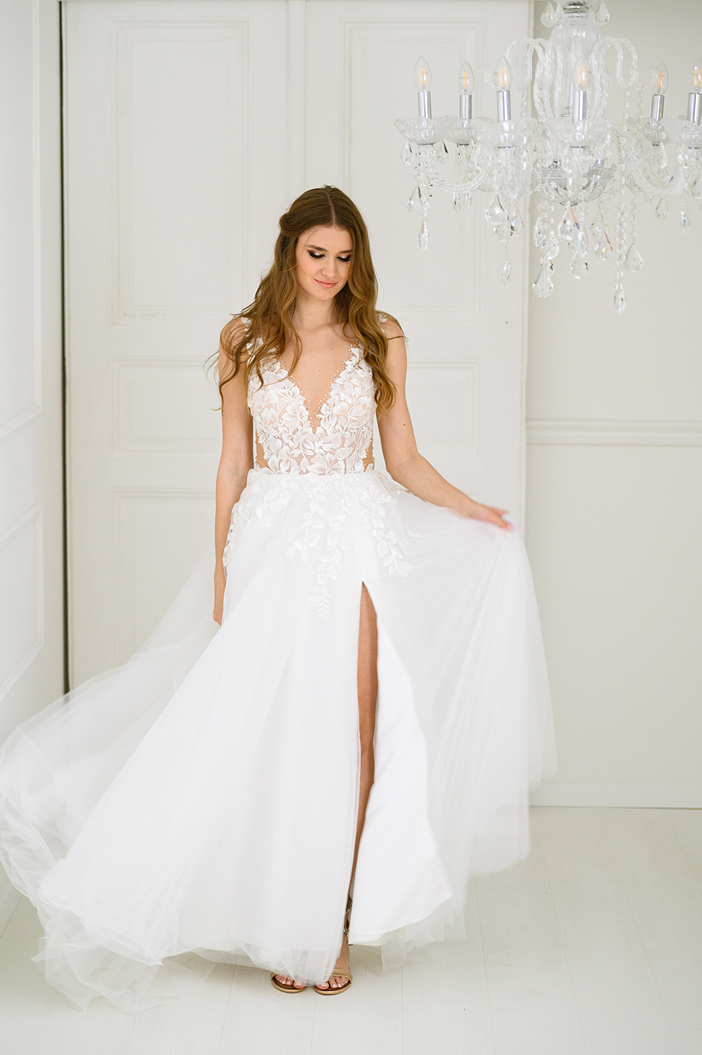 A Viola ruha A-vonalú, egyberészes tüllalkotás, amelyet levélmintás csipkedíszítés és apró, csillogó gyöngyök tesznek különlegessé.
