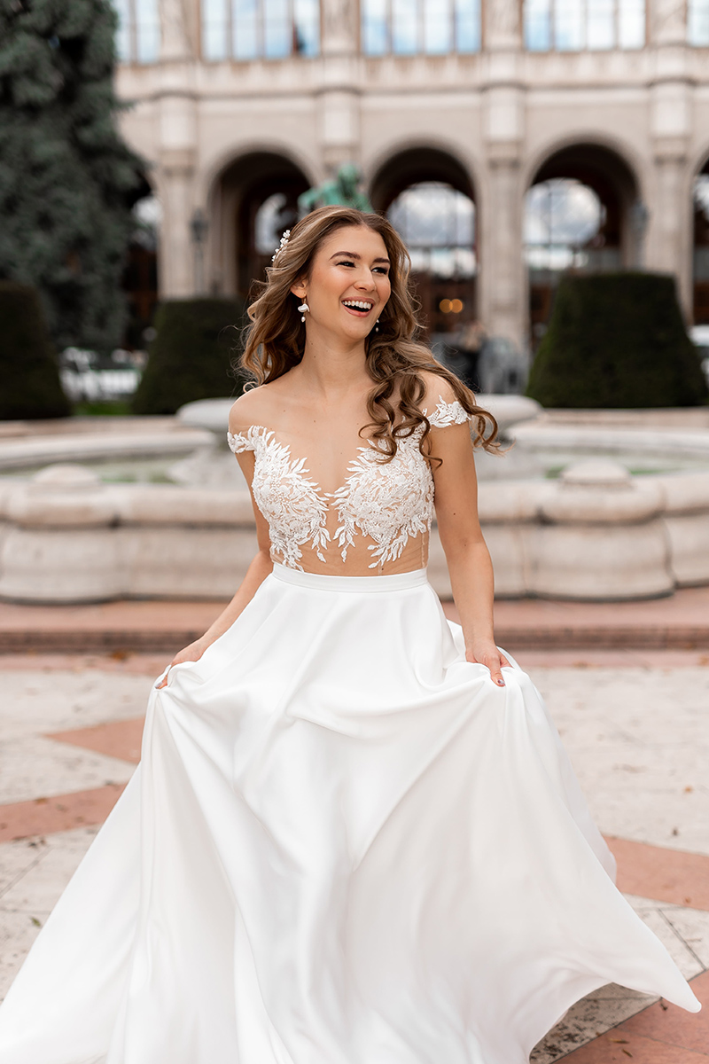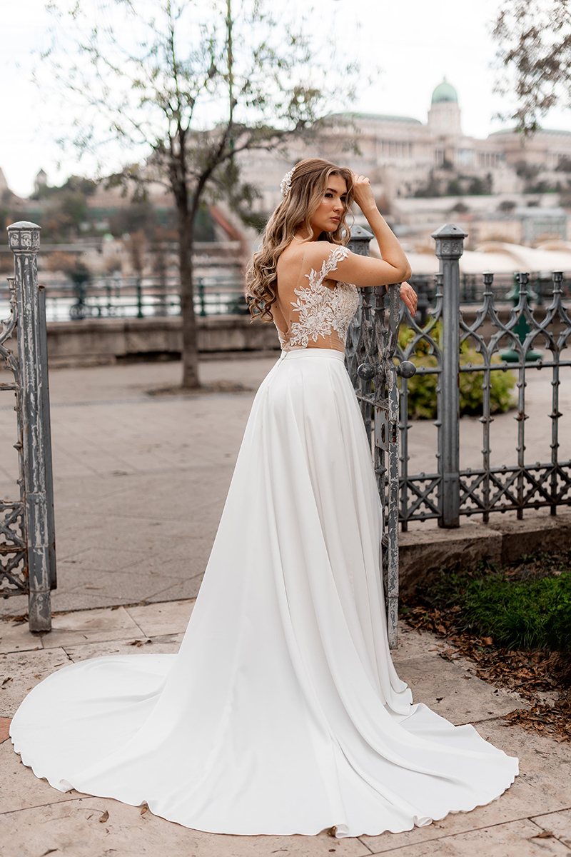 A Nancy ejtett vállú menyasszonyi ruha kétrészes, különleges csillogó csipkével díszített, ejtett vállú bodyval és letisztult szatén szoknyával készült.
