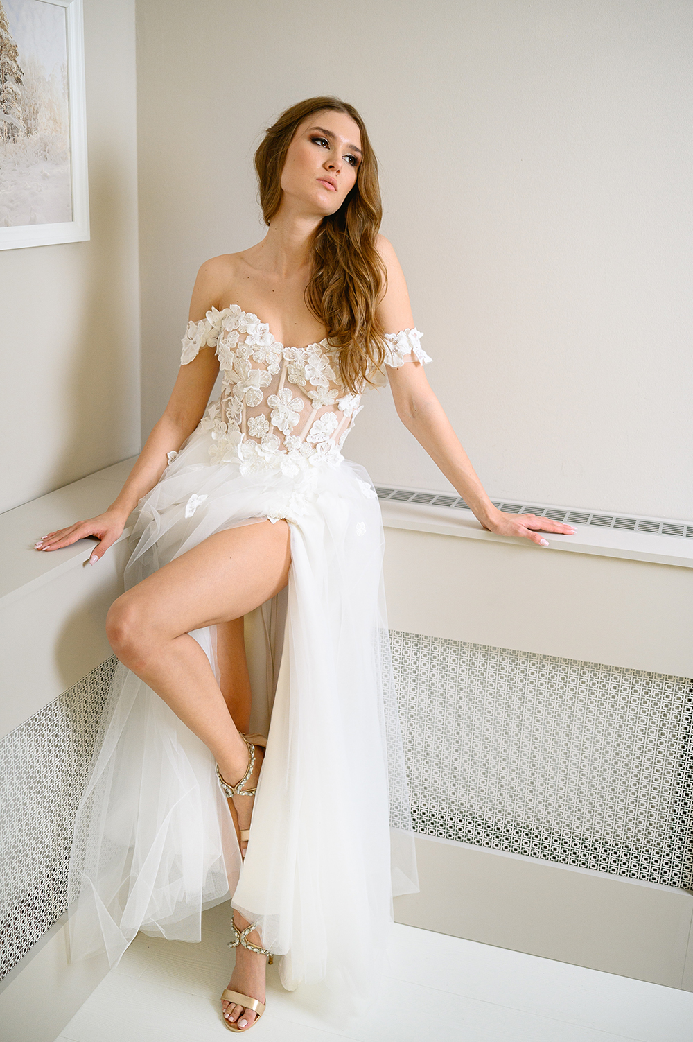 A hátul fűzős korzett A-vonalú, felsliccelt tüllszoknyával párosul, amely kifinomultan hangsúlyozza a menyasszony nőies sziluettjét.
