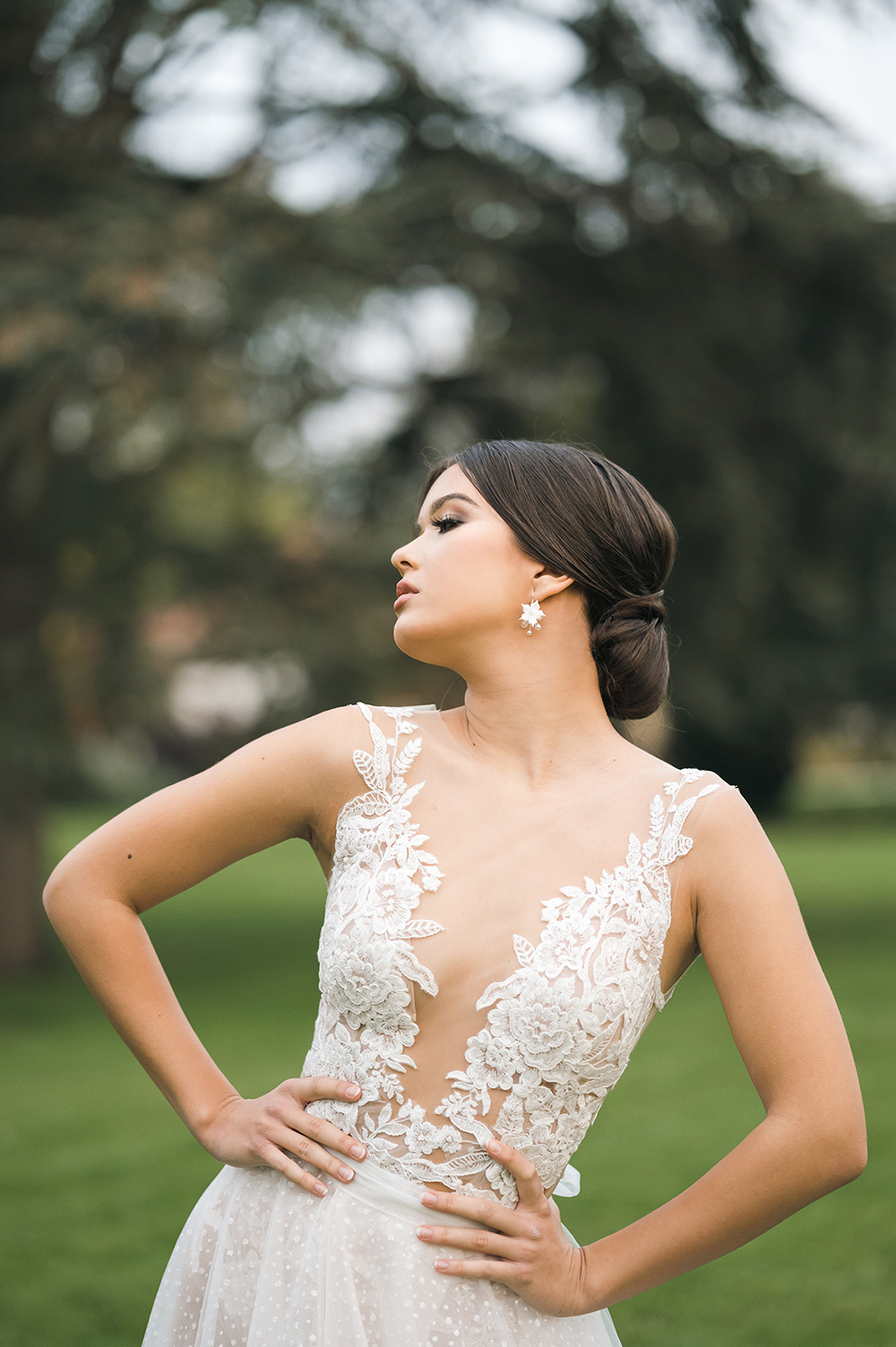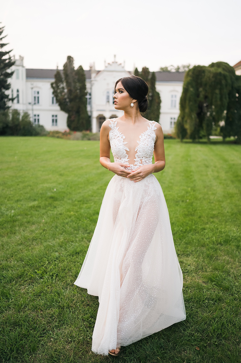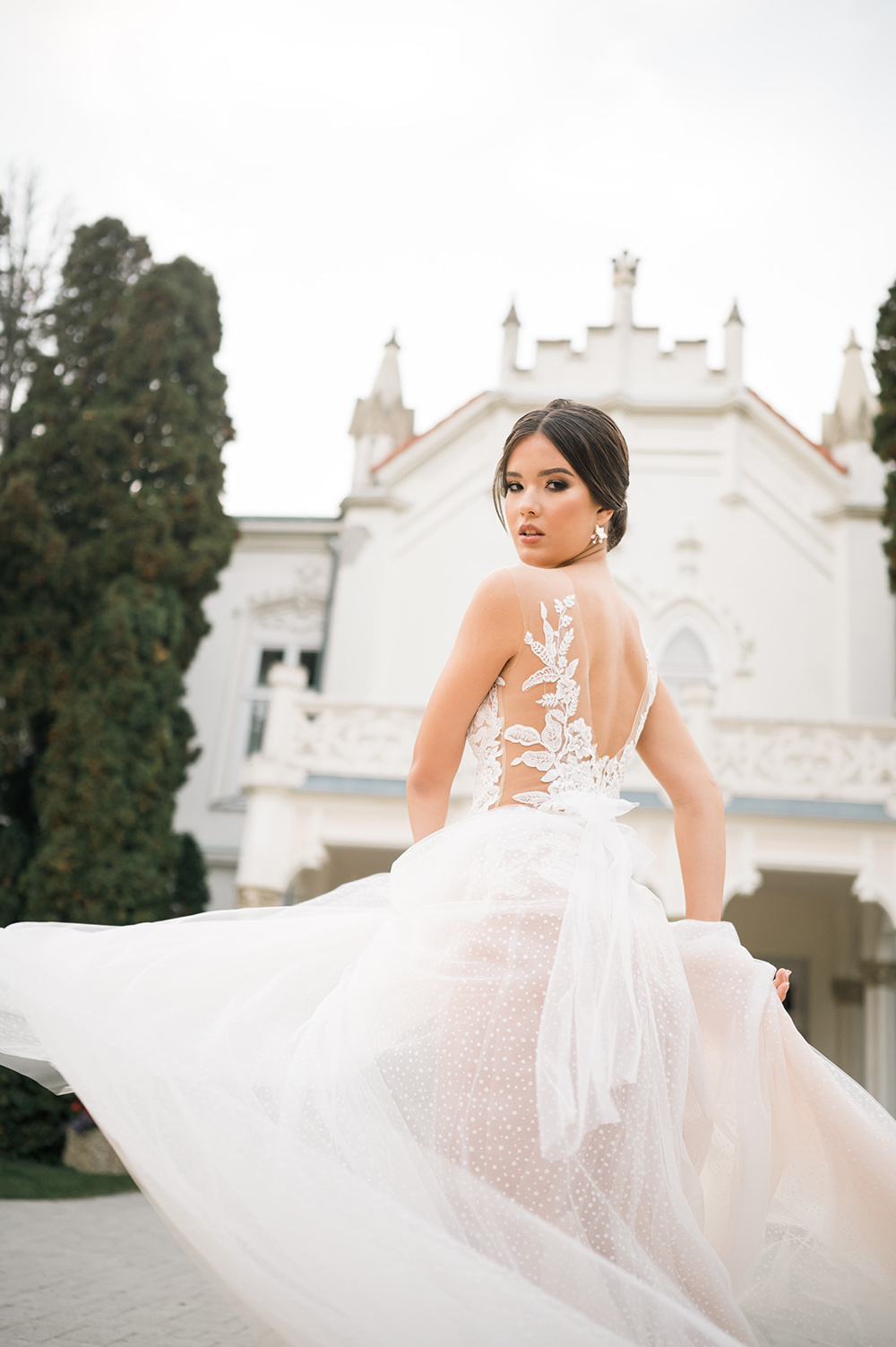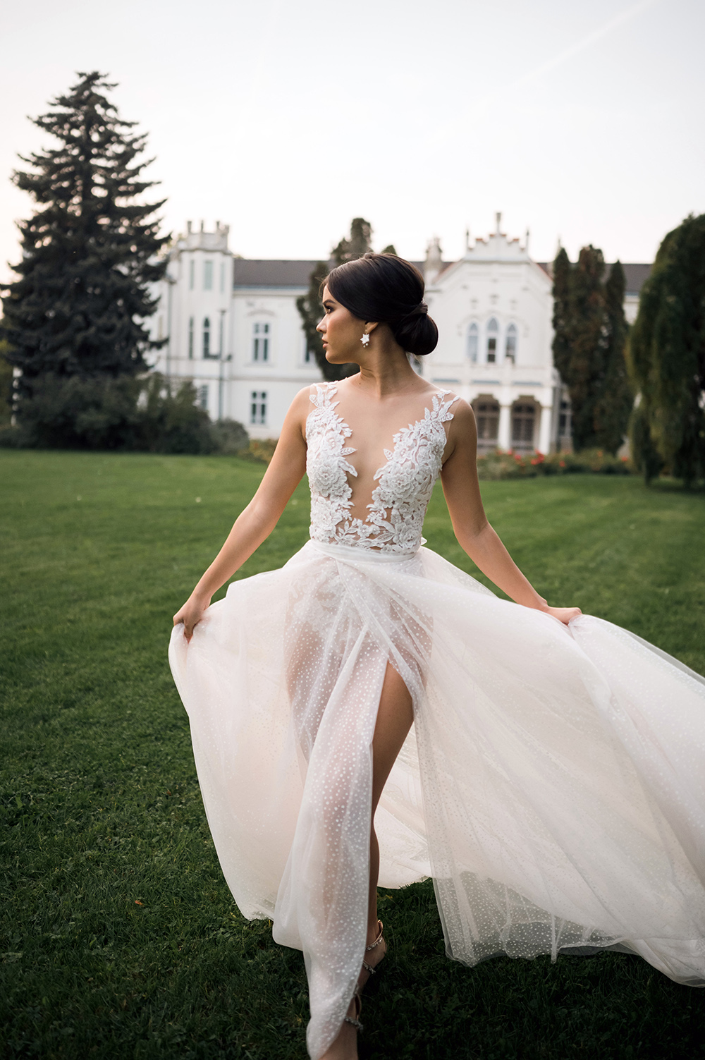 A Zoe ruha szintén kétrészes kreáció, mélyen kivágott, csipkemotívumos bodyval és több rétegű, csillogó, felkötős tüllszoknyával. A különleges anyaghasználat és a nőies szabásvonal egyedi, modern megjelenést biztosít.