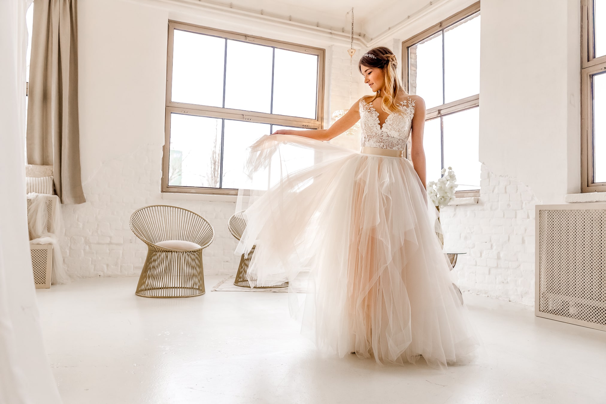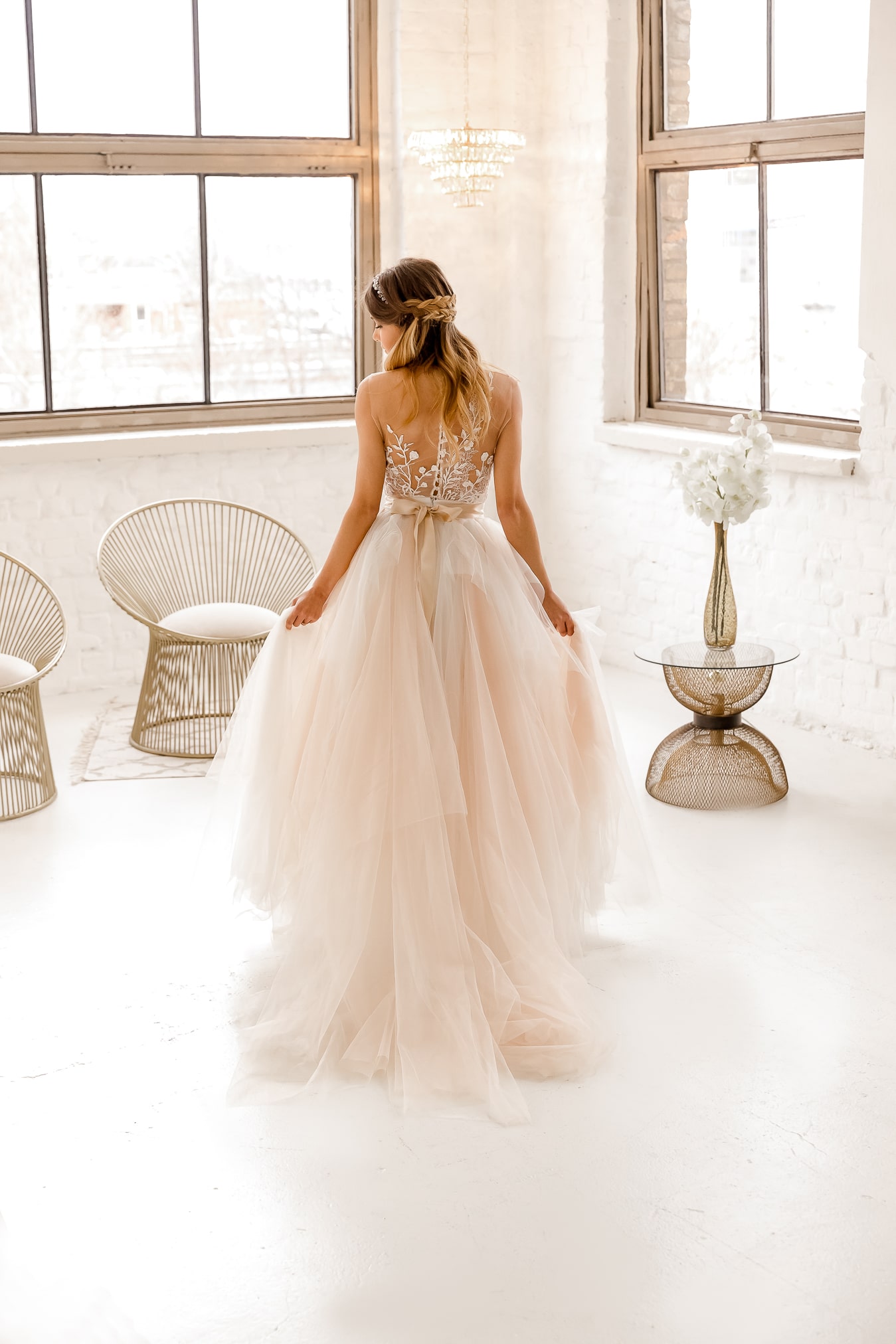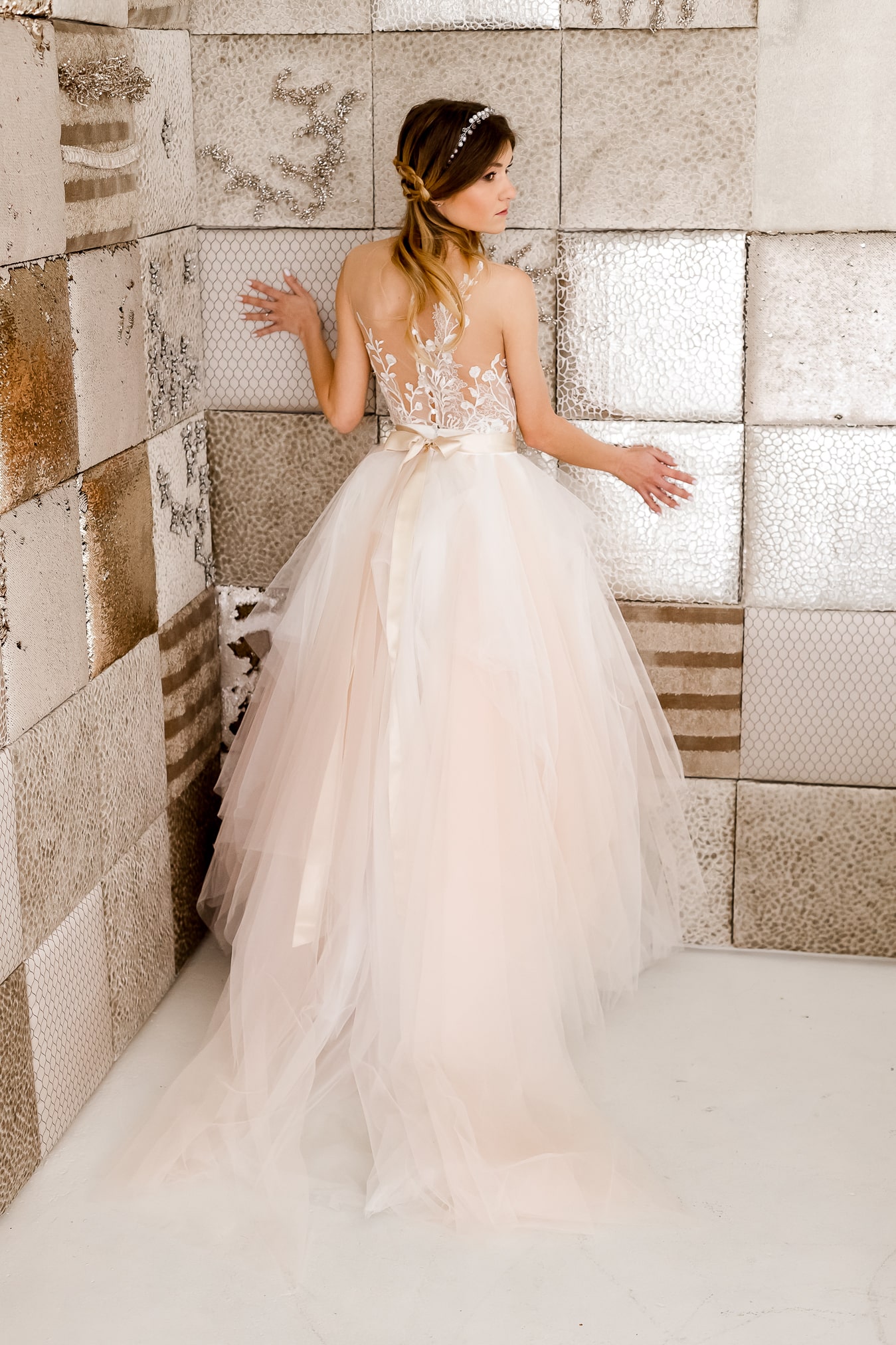 Illúziótüllre applikált csipke body és púder árnyalatú nagyobb volumenű tüllszoknya találkozása, amely egyedi, lágy színvilágával és finom részleteivel a modern romantika megtestesítője.