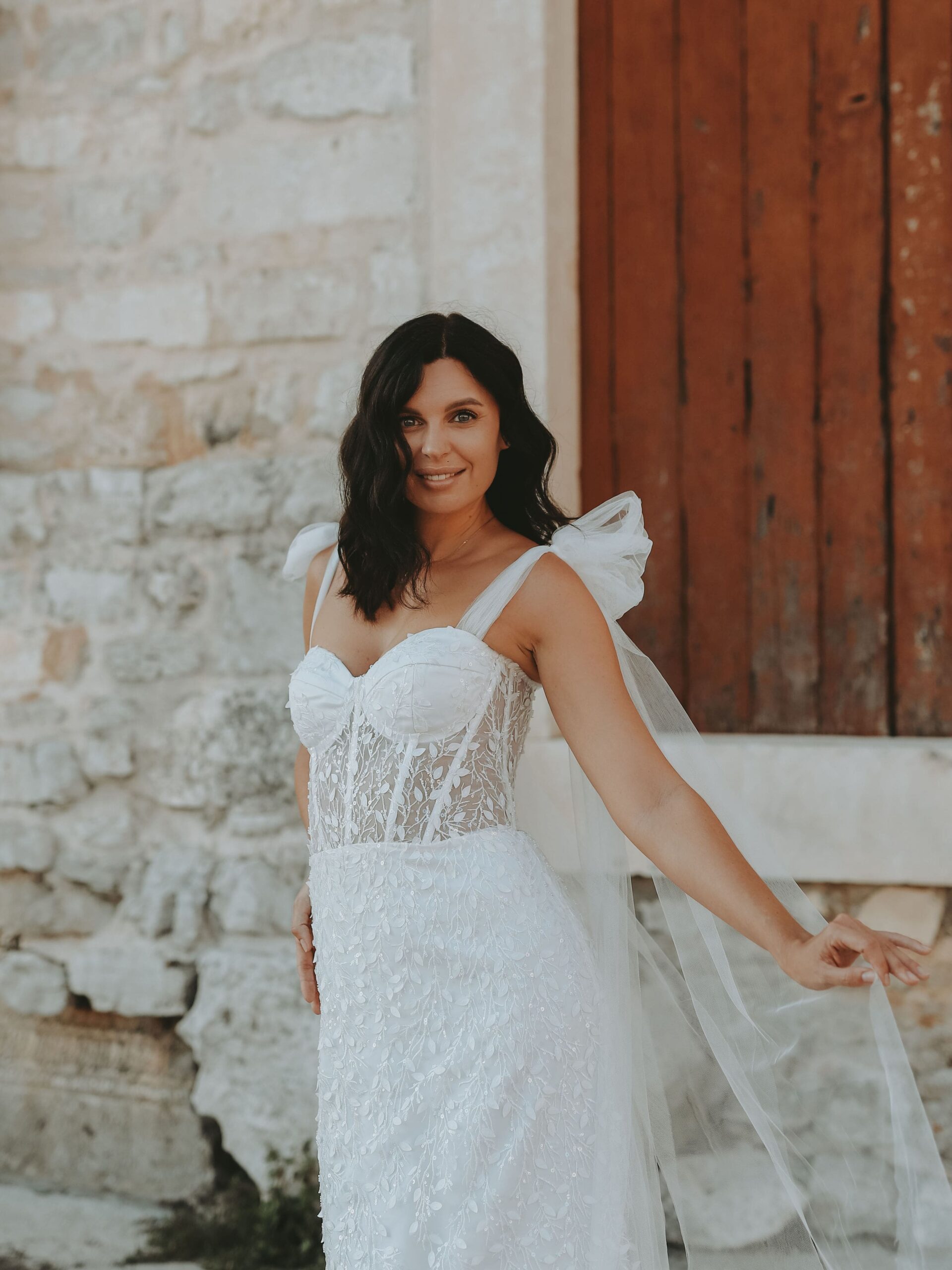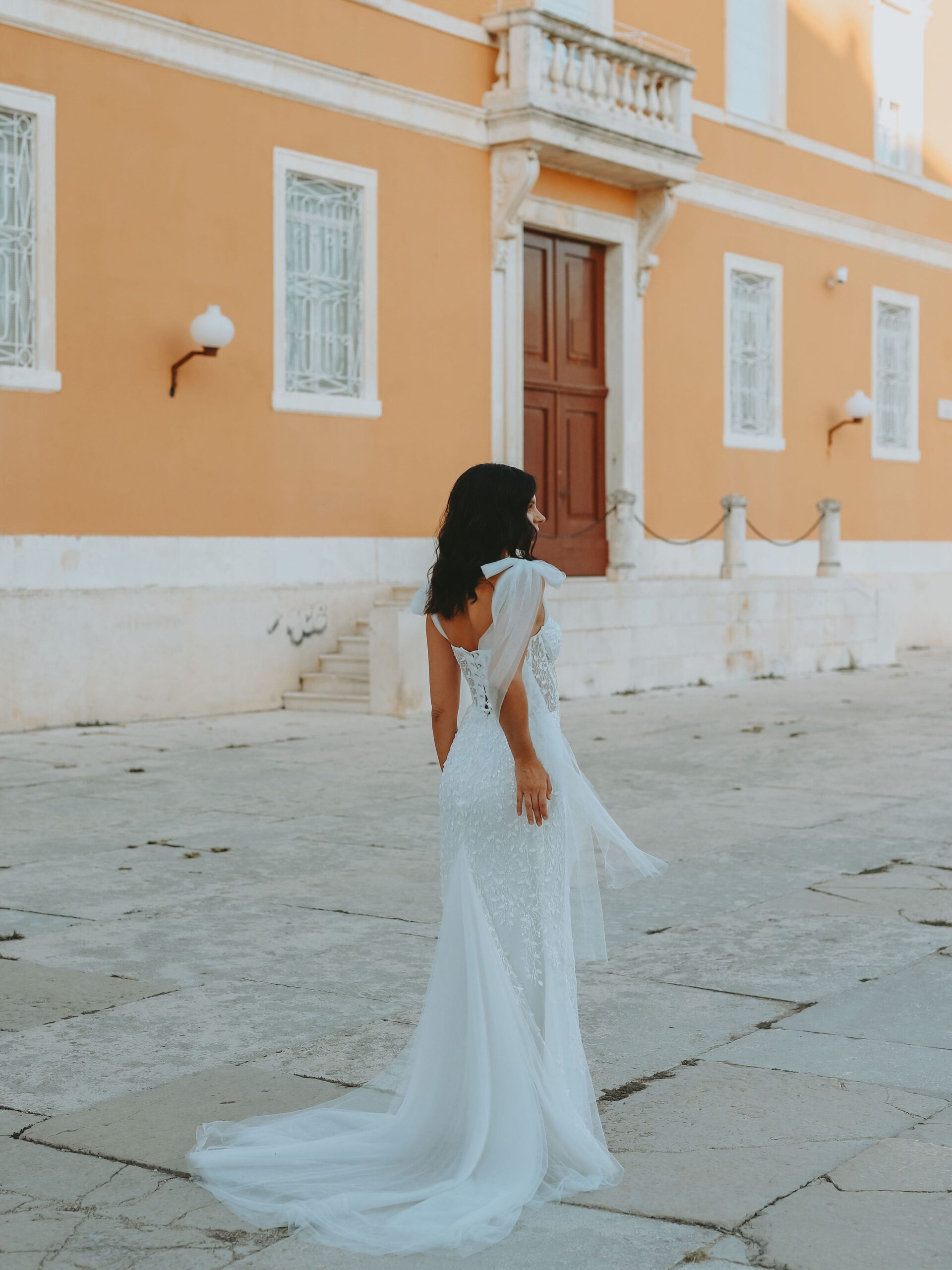 A Hermina sellő fazonú menyasszonyi ruha csillogó levélmintás csipkéjével és félsellő szabásával lenyűgöző megjelenést kínál. A vállrészen elhelyezett extrém masnis díszítés és a tülluszály romantikus, mégis modern hatást kelt. Hátul fűzős kialakítású, így tökéletesen alakítható.