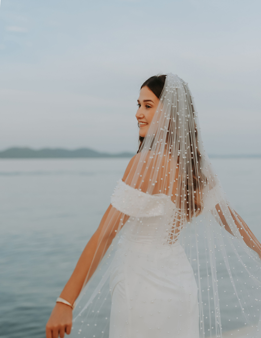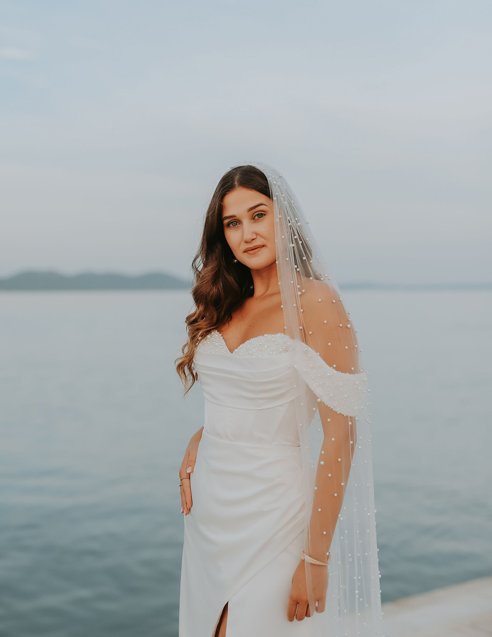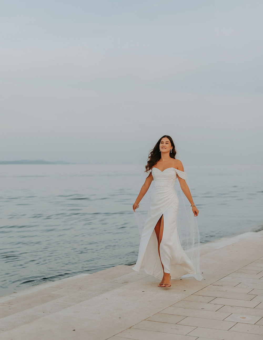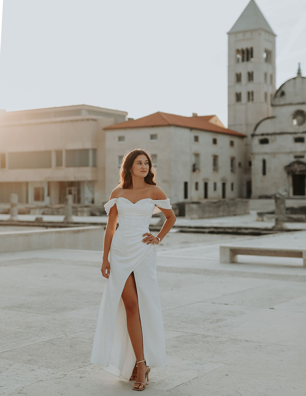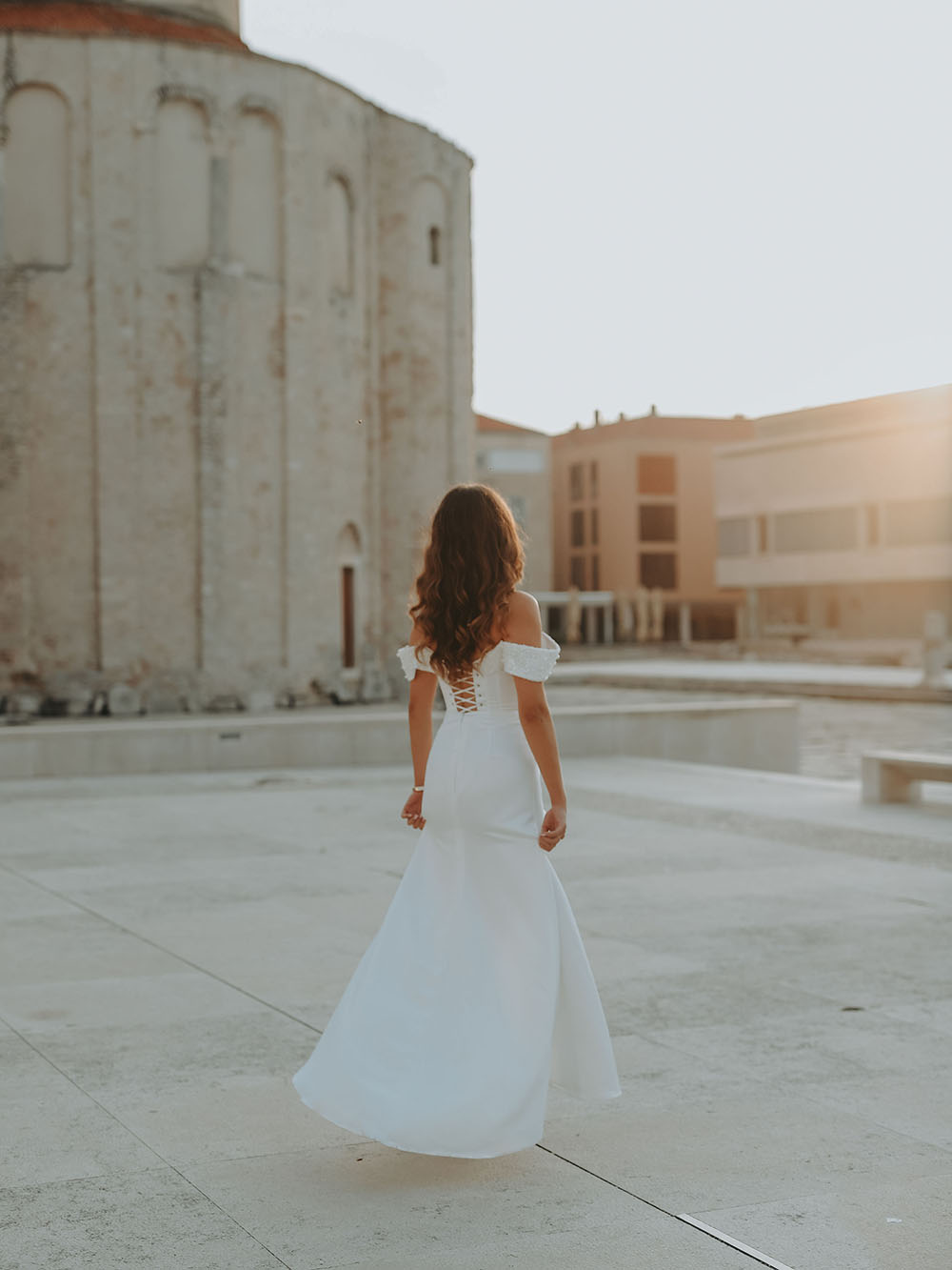 Gyöngyökkel díszített, korzettszerű felsőrésze lepatentolható pántokkal és hátsó fűzéssel készült, míg a félsellő, hajtásos, felsliccelt szatén szoknya letisztult eleganciát sugároz.