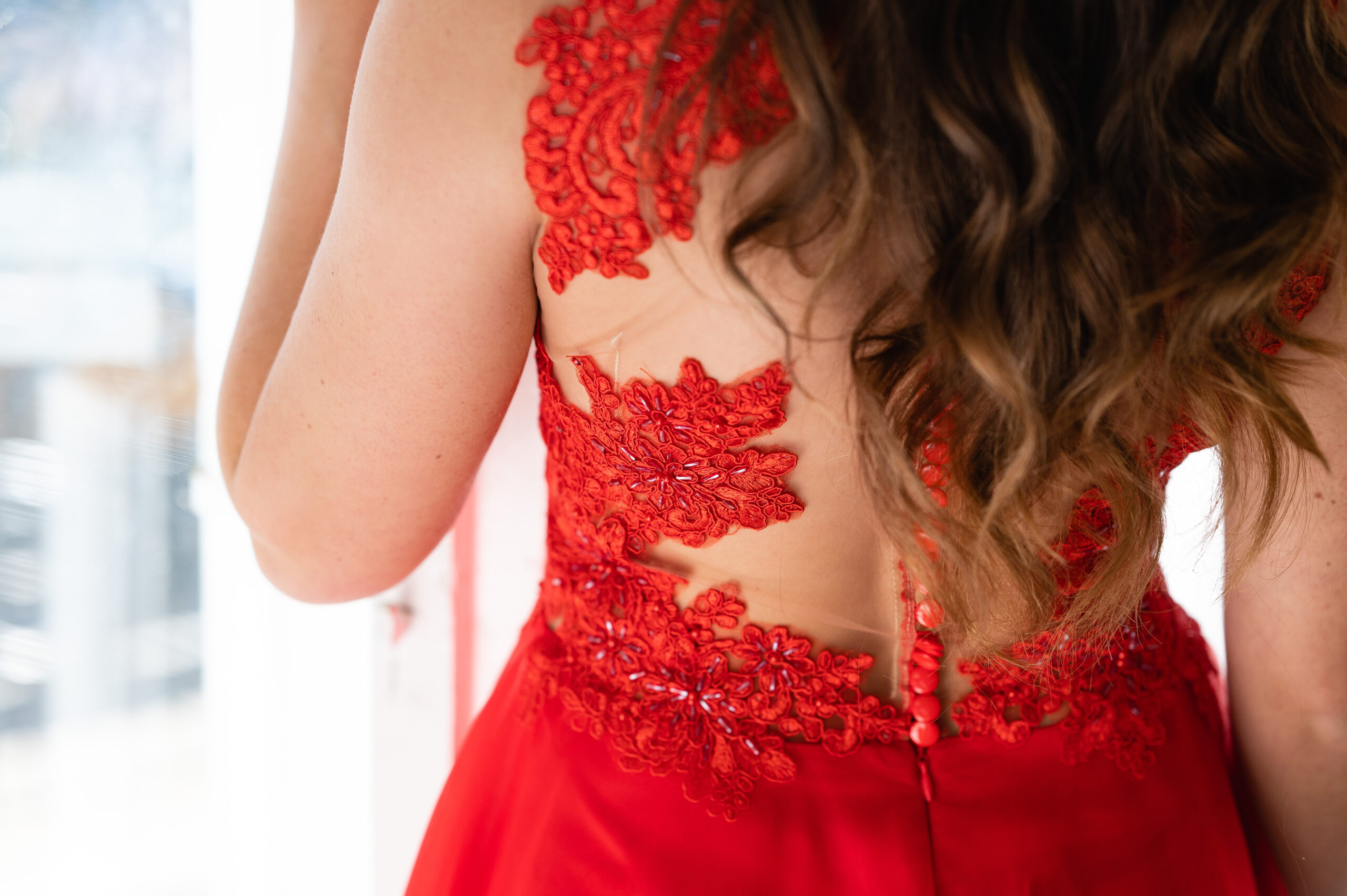 Illúzió tüll alapon gyöngyös csipke díszítéssel, elöl dekoltált megoldással, háta középen végig gombsorral záródik. Loknis tüllszoknyával rendelkezik.
